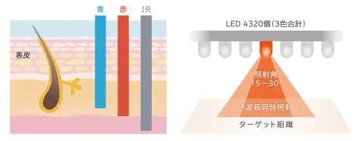 青色・赤色・白色のLEDを目的に応じた組み合わせで照射をすることによりさまざまな効果が期待できます。